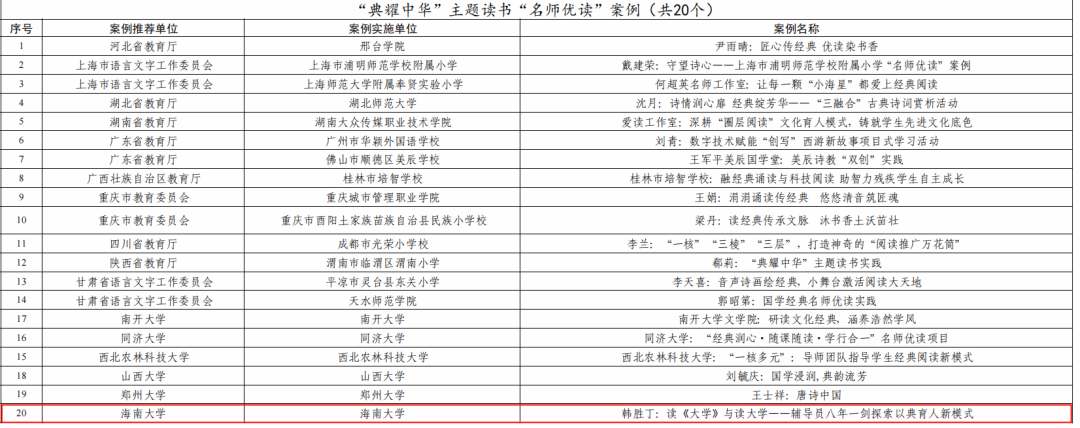 本站讯(记者 郑润泽)近日,国家语委办公室公布了2024年“典耀中华”主题读书行动创新实践案例名单,beat365英国官网网站报送的“韩胜丁:读《大学》与读大学——辅导员八年一剑,探索以典育人新模式”案例入选“典耀中华”主题读书“名师优读”案例,是海南省唯一入选的案例。2024年“典耀中华”主题读书“名师优读”案例名单。据悉,“典耀中华”主题读书行动是国家语委深入贯彻落实党的二十大精神,学习贯彻习近平文化思想,加快建设教育强国,...