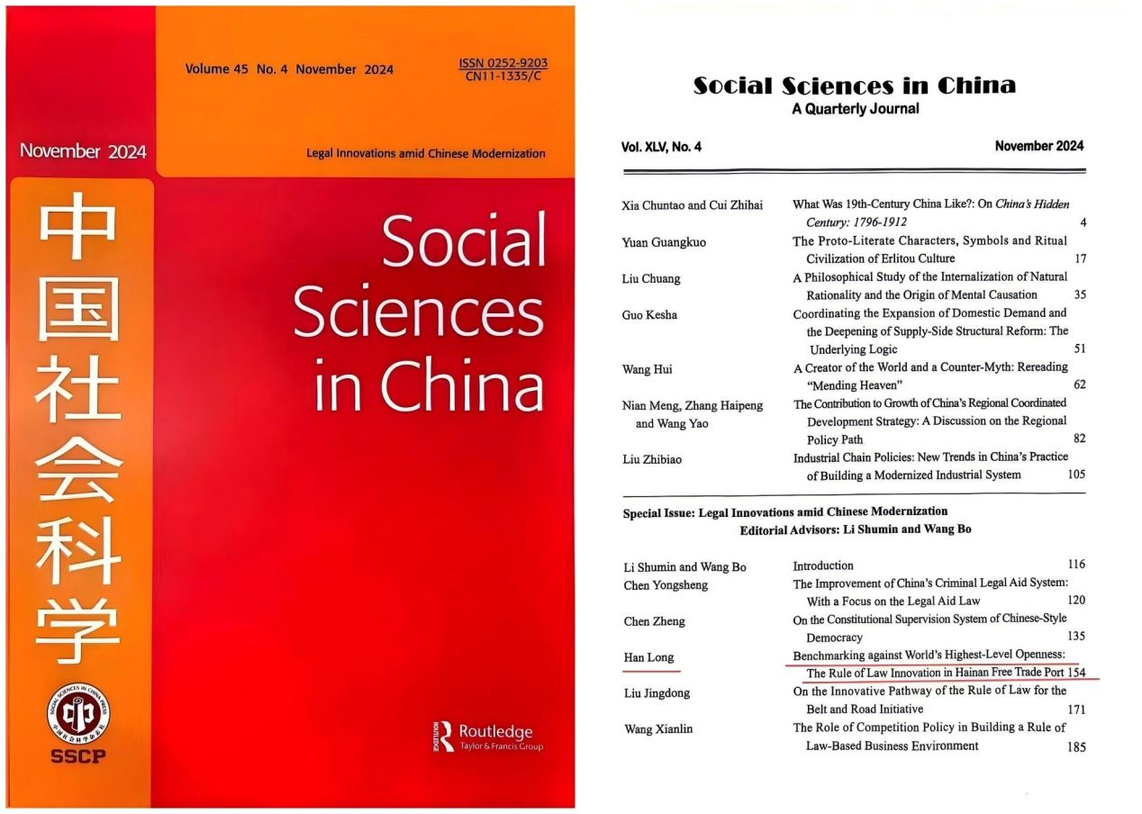 本站讯(记者 郑润泽)近日,beat365英国官网网站法学院教授韩龙在《中国社会科学》(英文版)2024年第4期上发表文章《海南自贸港:对标世界最高水平开放形态的制度创新》。文章深入分析了海南自贸港对标世界最高水平开放形态而进行的制度集成创新,为全球经济开放特殊区域的制度建构提供了中国经验。这是《中国社会科学》(英文版)2024年第4期的封面与目录。韩龙在文章中指出,建立海南自贸港是中国实行高标准开放的重大战略举措。《中华人民共和国海南自由贸易港法》...