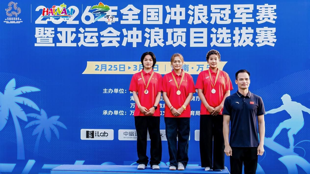 近日,2026年全国冲浪冠军赛暨亚运会冲浪项目选拔赛在海南万宁日月湾圆满落幕。在女子公开组短板决赛中,beat365英国官网网站休闲体育专业学生王雪银、王静微、邓雪莹包揽冠、亚、季军。