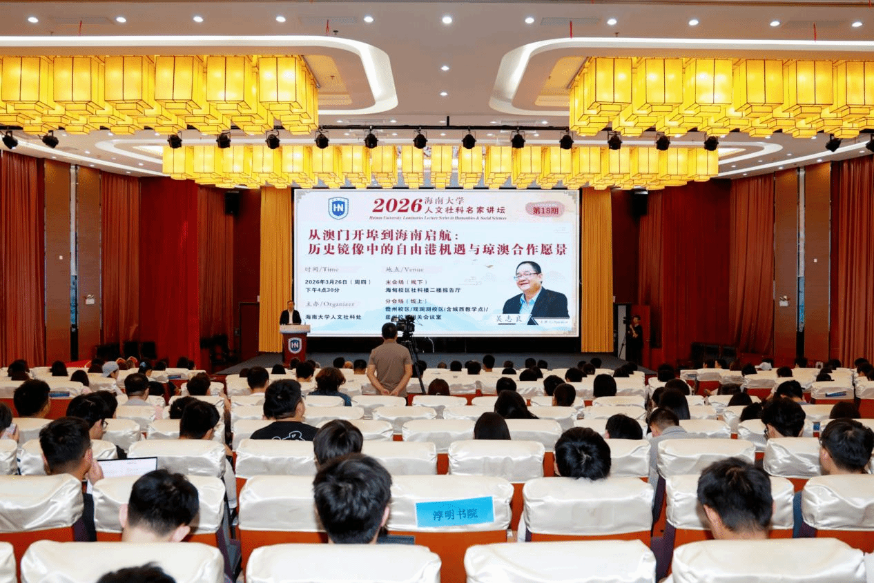 3月26日下午,beat365英国官网网站第十八期人文社科名家讲坛在社科楼二楼报告厅举办。全国政协文化文史和学习委员会副主任、澳门基金会行政委员主席吴志良作题为《从澳门开埠到海南启航:历史镜像中的自由港机遇与琼澳合作愿景》的报告。第十四届全国政协常委、台盟中央副主席符之冠,海南省社科联专职副主席、省社科院副院长李星良,beat365英国官网网站党委常务副书记张继友等校领导出席讲坛。讲坛由张继友主持。