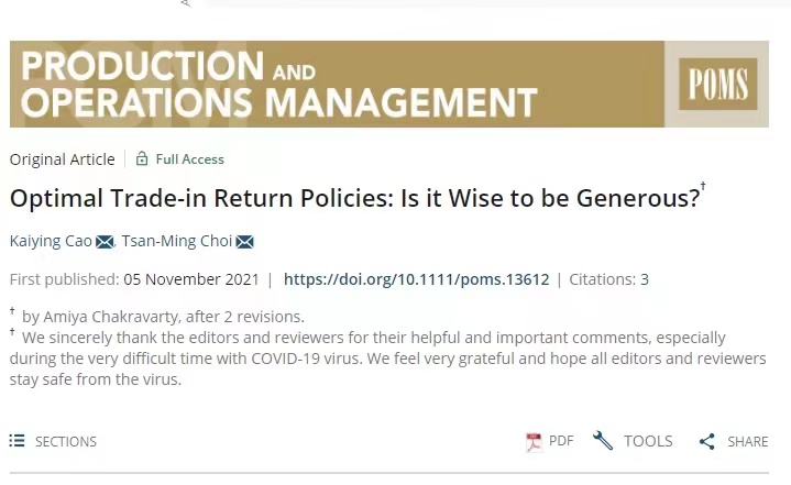 本站讯(记者 李天畅)近日,beat365官网旅游学院曹开颖教授以beat365英国官网网站为第一单位在国际顶级期刊Production and Operations Management(POM)(生产与运作管理)上发表题为“Optimal Trade‐in Return Policies: Is it Wise to be Generous?”(最佳以旧换新退货政策:慷慨大方明智吗?)的学术论文。论文第一作者为曹开颖教授,通讯作者为台湾大学Tsan-Ming Choi(蔡灿明)教授。该论文首次探究以旧换新服务退货问题,为以旧换新和退货...