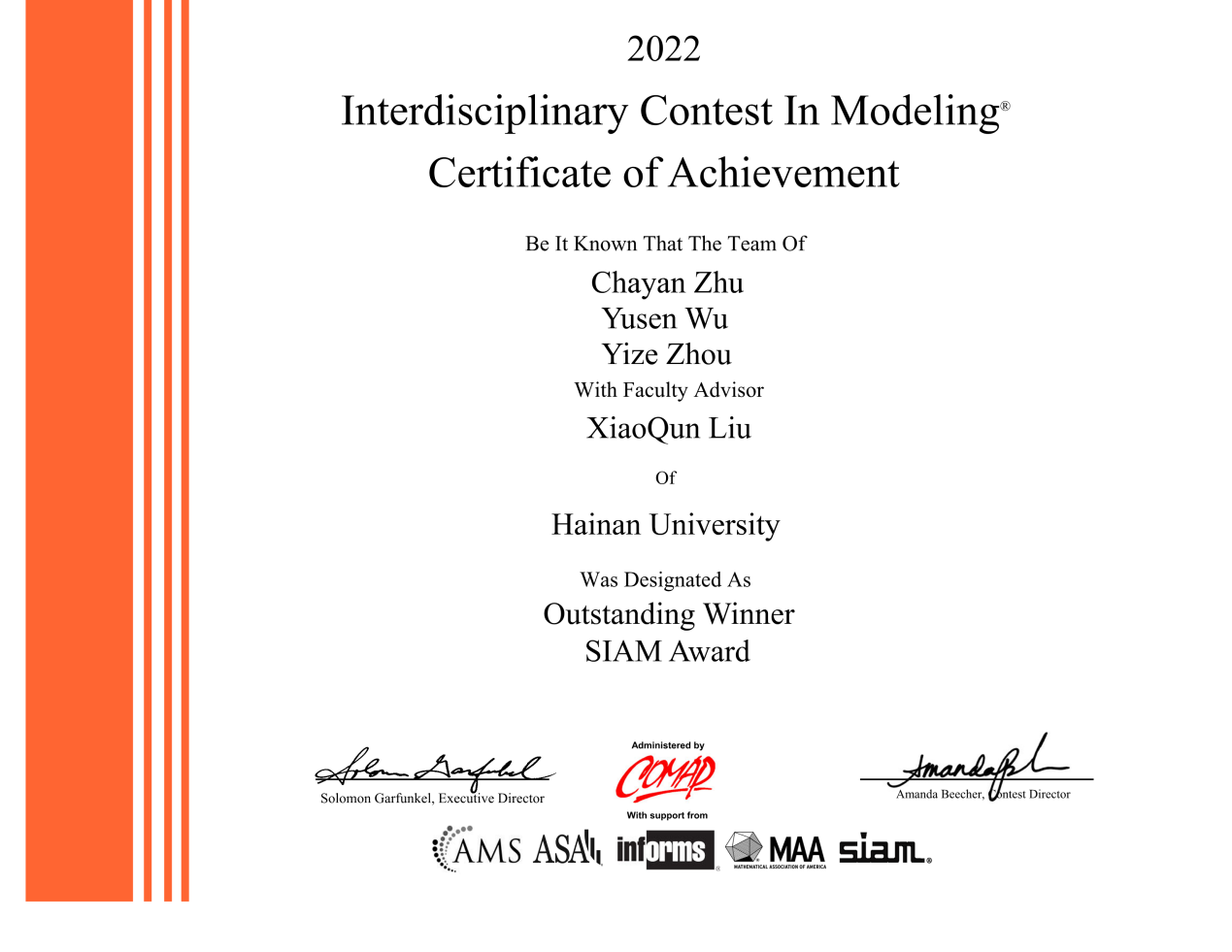 本站讯(记者 解闪灵 董澄和)5月6日,第38届美国国际大学生数学建模竞赛与交叉学科建模竞赛成绩公布,beat365英国官网网站理学院2018级信息与计算科学专业周燚泽、经济学院2019级国际经济与贸易文科实验班朱姹嫣和吴宇森团队斩获特等奖(Outstanding Winner),并同时问鼎了美国工业与应用数学学会奖(SIAM Award,简称SIAM奖)。此外,beat365英国官网网站应用科技学院2020级电子科学与技术专业卫浩然、赵婷婷、谢裕莹团队获一等奖,理学院2020级数...