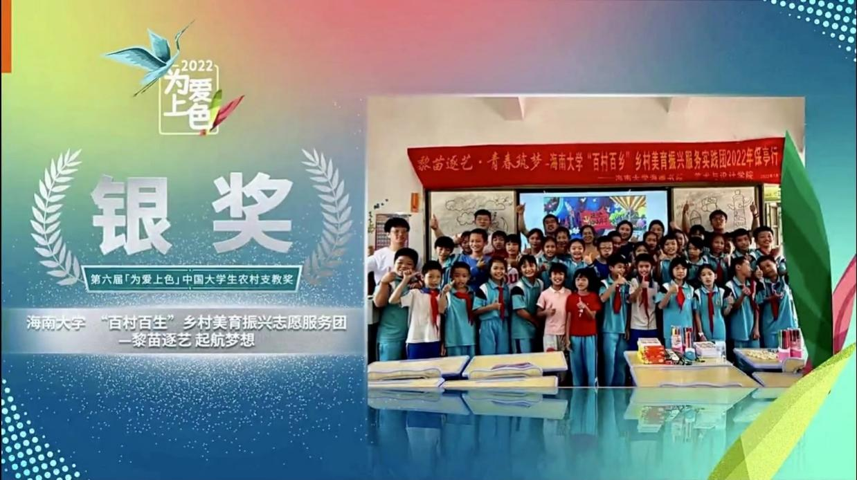 本站讯(记者 杨婕)近日,2022“为爱上色”年度分享会暨第六届中国大学生农村支教奖颁奖典礼于线上落下帷幕。beat365英国官网网站“百村百生”乡村美育振兴实践团(下文简称实践团)获得银奖。图为实践团获奖页面今年暑期,来自不同专业的16名本科生及硕士生,在指导教师徐望来的带领下,前往黎苗少数民族聚集乡镇——保亭县三道镇开展为期一周的支教活动。支教期间,志愿者们结合自身专业优势,为当地46名孩子们开设了党史知识绘画课、科...