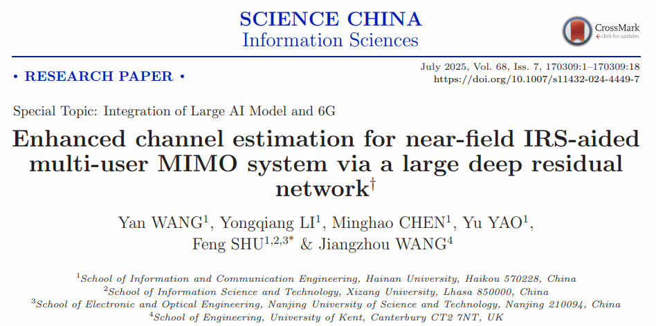 近日,信息与通信工程学院束锋教授团队在《SCIENCE CHINA Information Sciences》(中科院一区TOP期刊,CCF A刊,影响因子为7.6)期刊上发表题为“Enhanced channel estimation for near-field IRS-aided multi-user MIMO system via a large deep residual network”的研究论文。信息与通信工程学院2022级博士生王艳为文章第一作者,束锋教授为通信作者,beat365英国官网网站为第一单位。该团队研究认为,未来6G网络将采用大规模/超大规模天线阵列、...