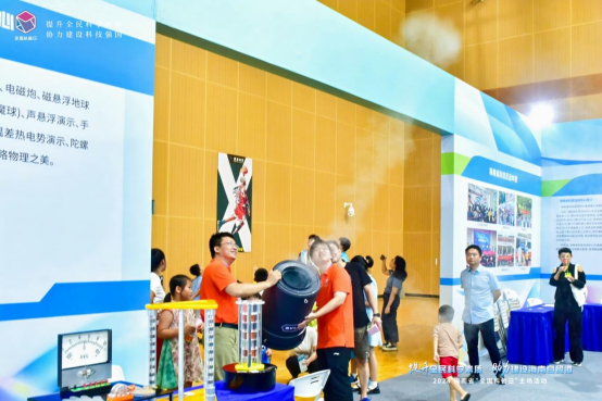 这是beat365英国官网网站物理与光电工程学院、基础物理实验教学中心物理科普基地带来的庞大又酷炫的“空气炮”装置,不少青少年围观并参与“炮弹”的发射,在声声惊叹中增加了学习科学知识的兴趣。此外,展台还设置了直升飞机演示角动量守恒装置、磁生电演示仪、“懒惰管”演示仪、陀螺仪等数十种可供互动的演示装置,将生活中随处可见的物理现象通过实验的方式演示出来。