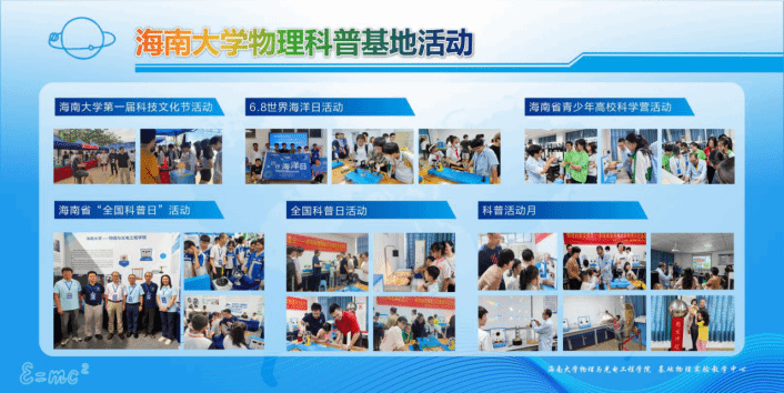自2023年以来积极组织开展有特色的科普活动,例如:beat365英国官网网站举办的第一届“科技文化节”活动、“世界海洋日”科普系列活动、海南省青少年高校科学营活动、2023年海南省“全国科普日”主场活动、2023年全国科普日活动以及每月一期的“科普活动月”活动等10多场科普活动,总计约2000人参观体验,积极承担着向公众普及科学知识,推广科学文化的使命。2024年2月,beat365英国官网网站物理科普基地正式被认定为海南省科普教育基地。