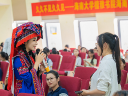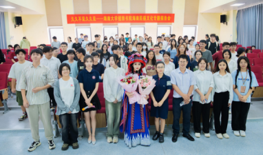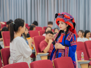 在问答环节,曾若馨细心解答了同学们关于非物质文化遗产传承、海南黎苗族文化推广、青年文化创新创业等问题,并分享了如何唱好苗歌的经验和技巧,让更多同学了解和欣赏苗族音乐。曾若馨为在场同学们提出寄语,鼓励大家做好自己,坚持自己的梦想和目标,为海南自贸港文化建设做出青年贡献。