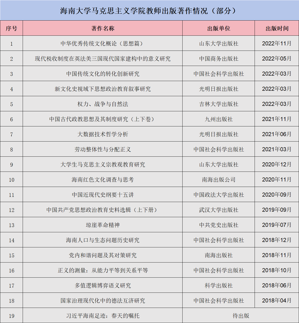 依托海南省中国特色社会主义理论体系研究中心海大基地、海南省高校中国共产党革命精神与文化资源研究中心等平台,围绕习近平新时代中国特色社会主义思想海南实践、琼崖革命精神、党的海洋战略等方向开展研究。获得国家级项目42项,其中,国家社科基金重大项目3项,重点项目4项;出版《琼崖革命精神》《中国共产党思想政治教育史料选辑》(上、下)等著作40余部;在《人民日报》《光明日报》《经济日报》《海南日报》等党媒党刊上发表重要理论文章70余篇;向党政机关提交资政报告50余篇,其中获省部级领导肯定性批示和机关采纳近30份;获得省级社科成果奖22项。