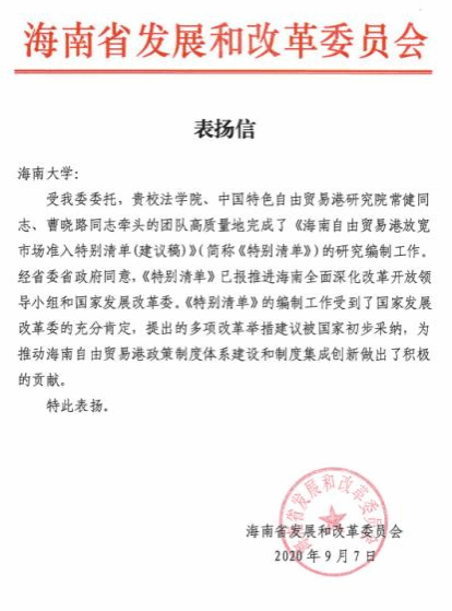 依托中国特色自由贸易港研究院等科研平台,围绕海南自由贸易港法律法规体系建设中的重大问题开展研究,《海南自由贸易港法(专家建议稿)》经中国法学会采纳呈报全国人大获得王晨副委员长批示,诸多条款被全国人大《中华人民共和国海南自由贸易港法(审议稿)》所吸收;《海南自由贸易港总体方案60条》获得中央政治局常委韩正批示;承担《海南自由贸易港优化营商环境条例》等地方立法起草工作;海南自由贸易港法律创新团队荣获2021年海南省优秀人才团队。