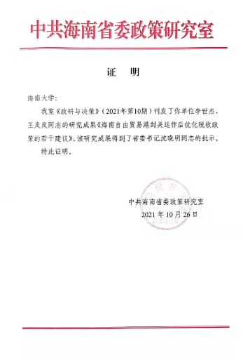 依托海南省开放型经济研究院、中国(海南)竞争政策研究中心、自贸港治理创新与智慧监管重点实验室等平台,围绕贸易投资自由化便利化、金融开放等问题开展研究,承担《海南自由贸易港公平竞争条例》等立法起草工作,参与《海南省鼓励类产业补充目录》《海南自由贸易港旅游业、现代服务业、高新技术产业鼓励类目录》等编制,获得海南省委省政府主要领导批示50余项,在《人民日报》《光明日报》等重要党报党刊上发表相关文章30余篇,获得省部级一等奖6项。