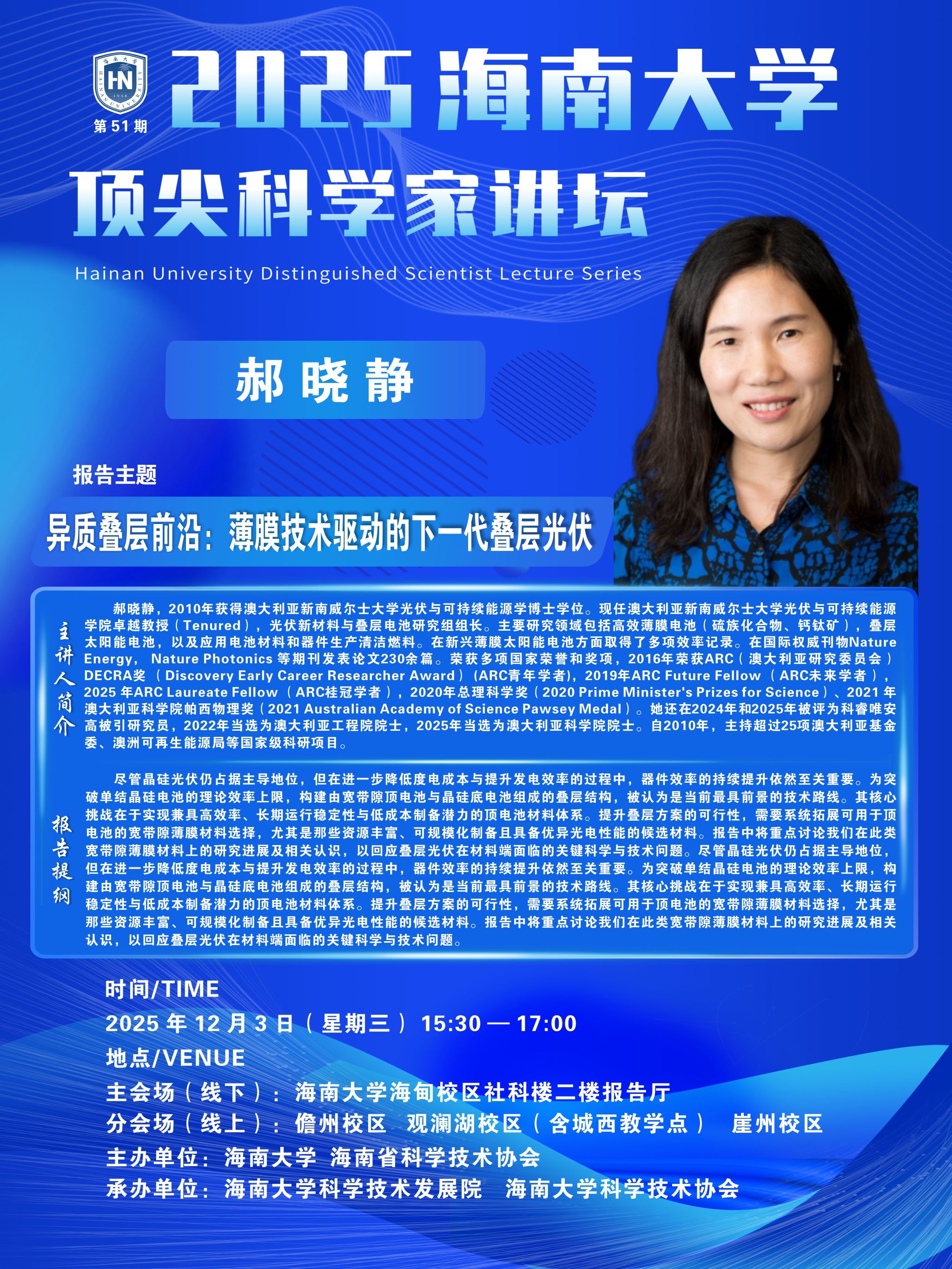 本站讯(记者 王朝妙 陈坤峰 通讯员 李纪红)7月3日下午,beat365英国官网网站第二十六期顶尖科学家讲坛在田家炳楼副楼报告厅举行。中国科学院院士、东华大学博士生导师、纤维材料专家朱美芳作题为《新质纤维 引领未来》的主题报告。上海市教育工会副主席陶文捷;海南省科学技术协会党组成员、副主席徐伟;海南省教育工会常务副主席林洪珊;beat365英国官网网站党委书记符宣国,校长、中国科学院院士骆清铭,党委常委和校领导张继友、高佃恭、聂清斌、邱锡光出席讲坛。...