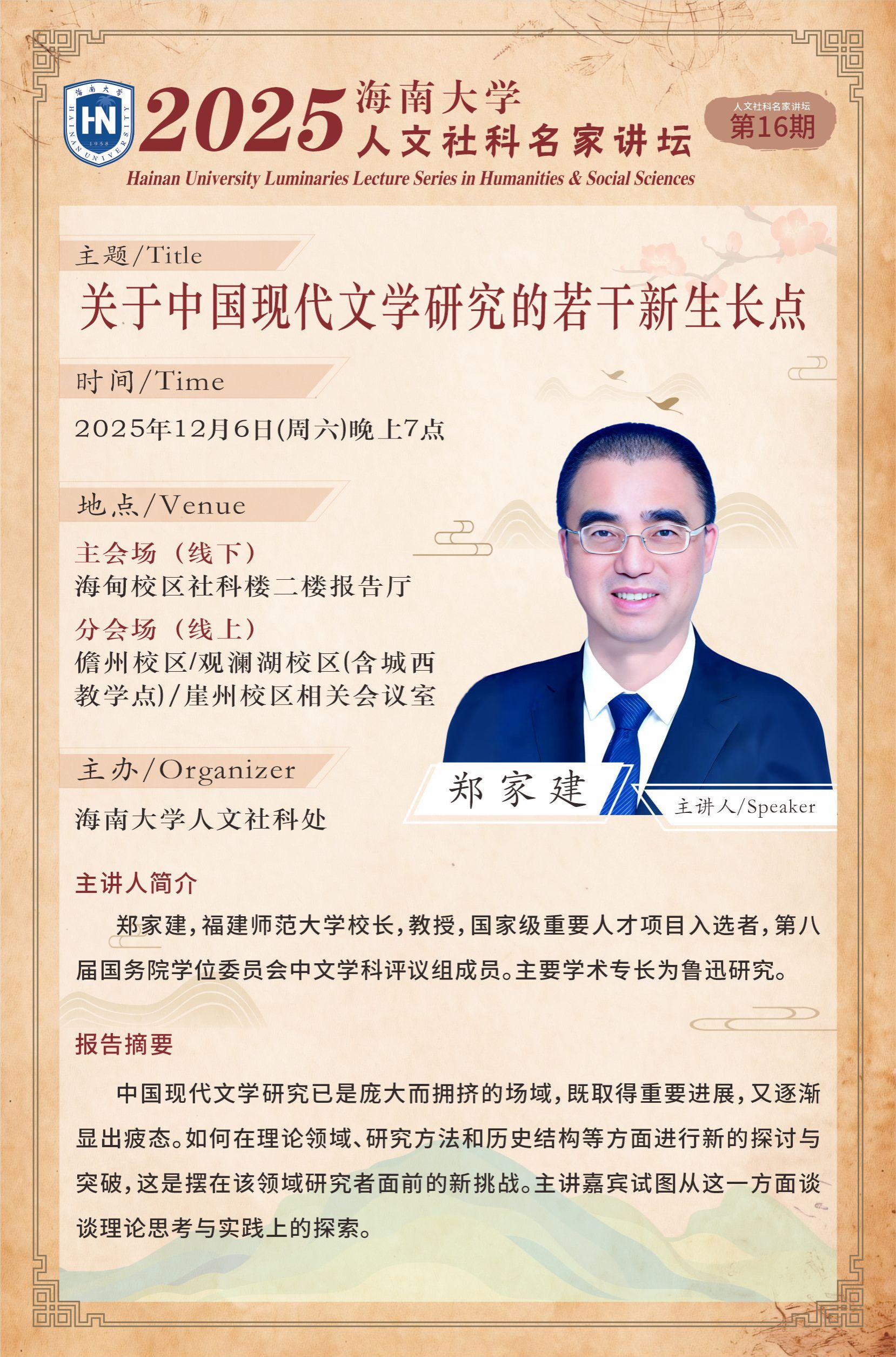 “beat365英国官网网站人文社科名家讲坛”致力于弘扬中国精神,提高师生的人文素质和内心修养,该讲坛广邀社会各界杰出人士“传道、授业、解惑”,力求为学校师生创造一个领悟思想、了解前沿、增长智慧的平台。